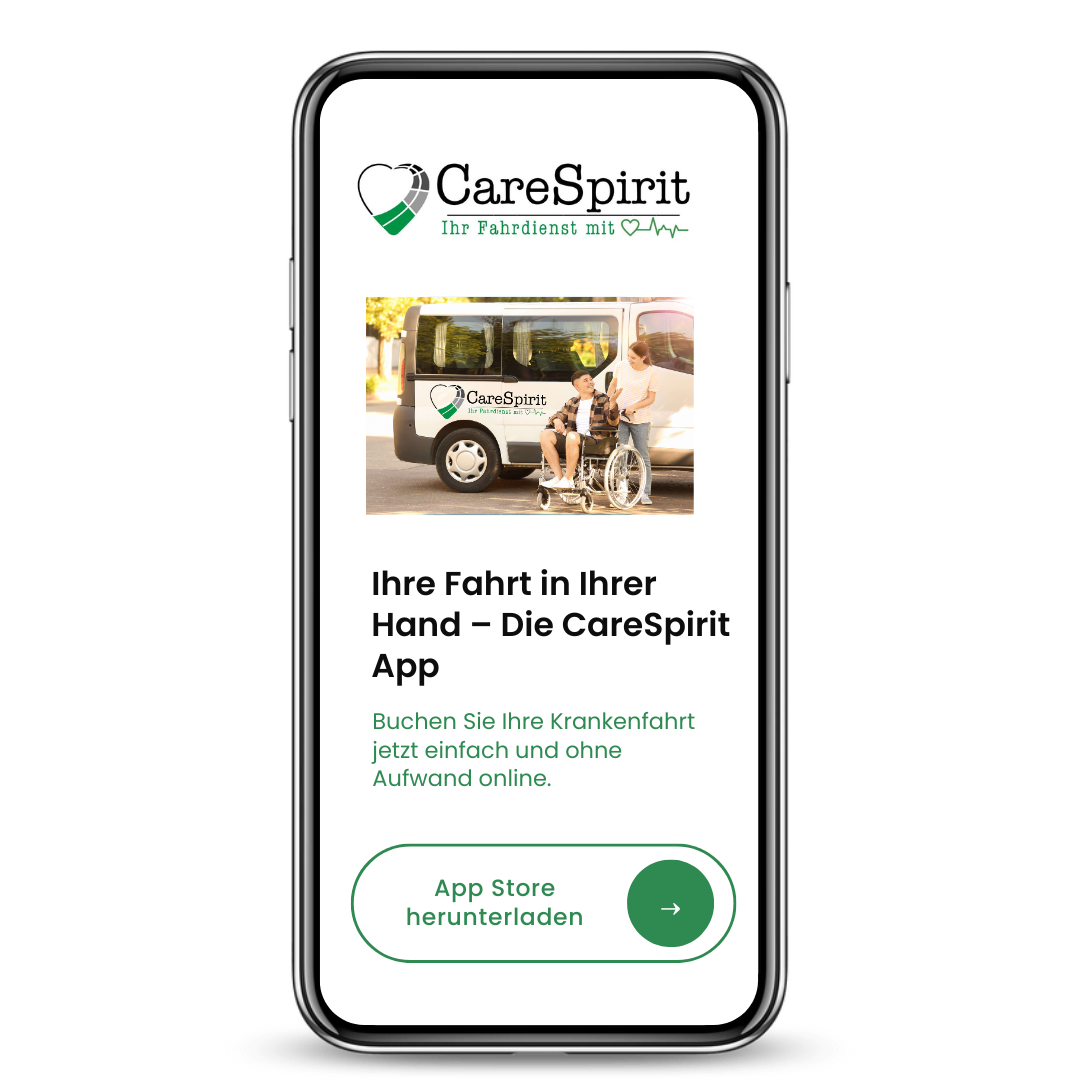 Sie benötigen einen zuverlässigen Fahrdienst für medizinische Termine, Reha oder Dialyse? Mit CareSpirit buchen Sie Ihre Krankenfahrt einfach online oder über unsere App – schnell, bequem und sicher. Unsere freundlichen Fahrer holen Sie pünktlich an Ihrer Haustür ab und bringen Sie zuverlässig zu Ihrem Ziel. Ob einmalig oder regelmäßig – wir sind für Sie da.